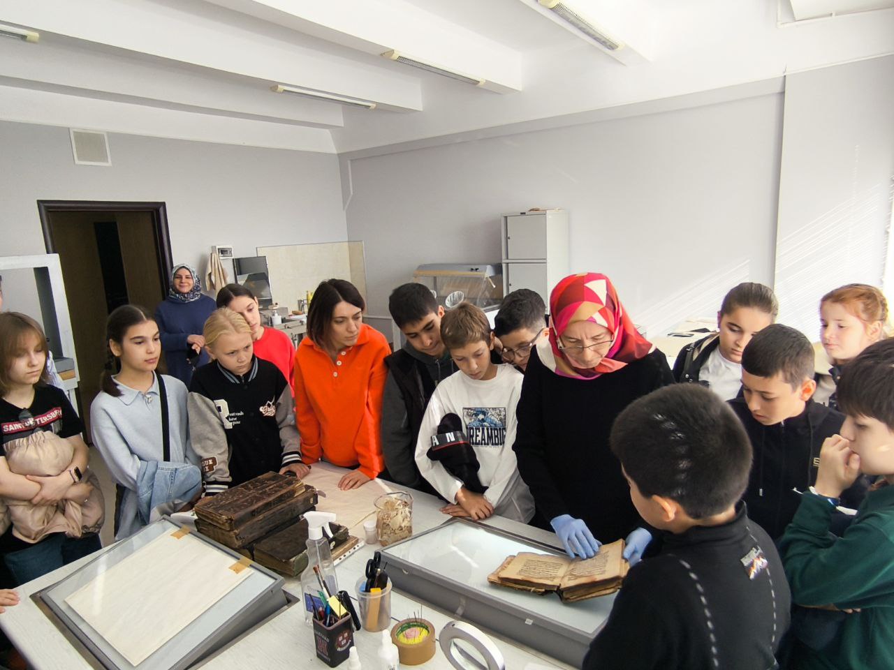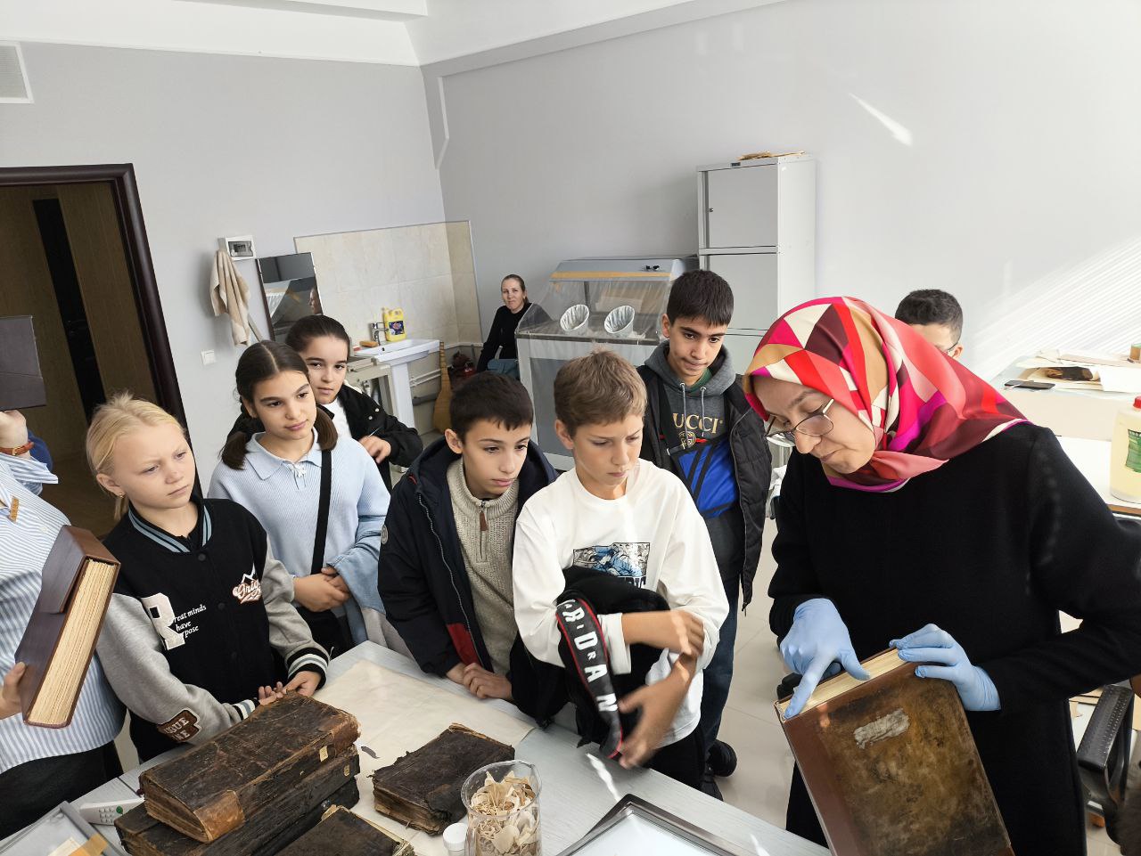 В Реставрационной лаборатории школьникам рассказали, что в Фонде восточных рукописей Института хранится более 3000 рукописей – это крупнейшее собрание на российском Кавказе. Кроме того, в других фондах страны находятся рукописи, переписанные в Дагестане, а в самом регионе существует более 400 частных рукописных коллекций.