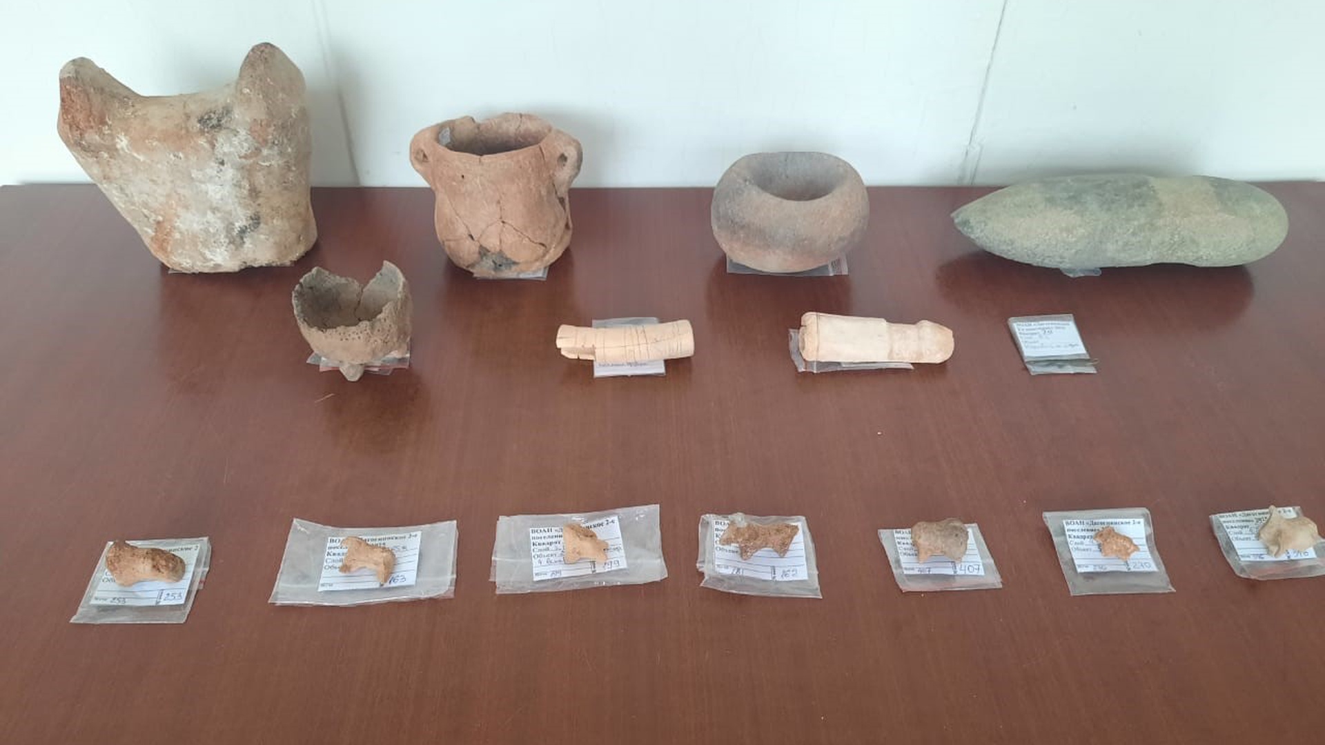 На выставке были представлены найденные артефакты: керамические сосуды, включая редкие расписные и высококачественные образцы, изготовленные на гончарном круге; кремневые вкладыши серпов; каменные жернова и тёрочники; пряслица, наконечники стрел и многие другие предметы, датируемые первой половиной – серединой IV тыс. до н.э., а возможно, и более ранним временем.