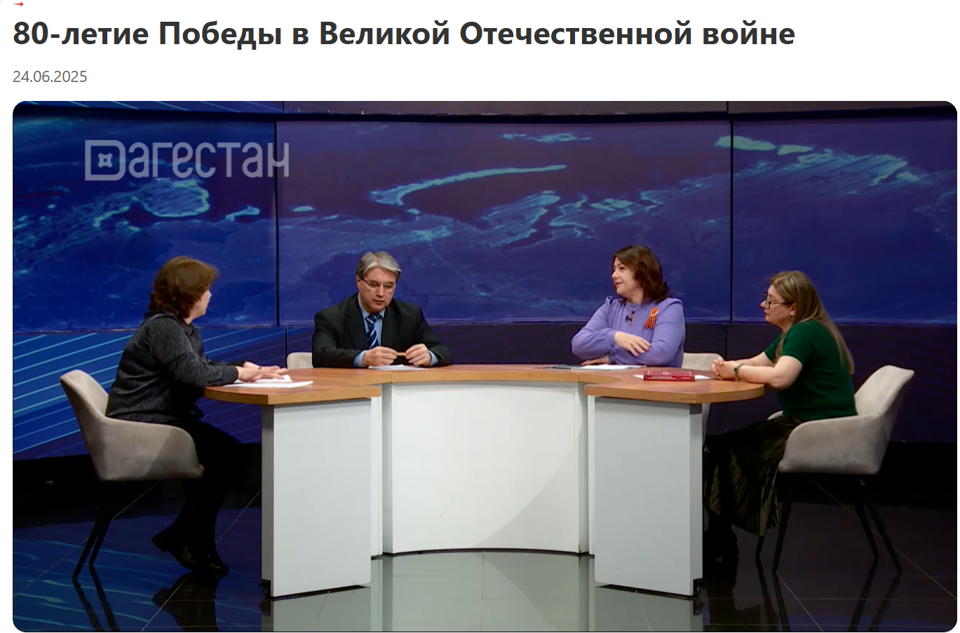 20 июня 2025 г. в эфире телеканала «РГВК-Дагестан» в рамках передачи «Круглый стол» с Магомедом Махатиловым выступили научные сотрудники Института истории, археологии и этнографии ДФИЦ РАН. О вкладе Дагестана в борьбу против немецко-фашистских захватчиков говорили участники программы, кандидаты исторических наук: Лейла Каймаразова, Юлия Лысенко и Мадина Нагиева.