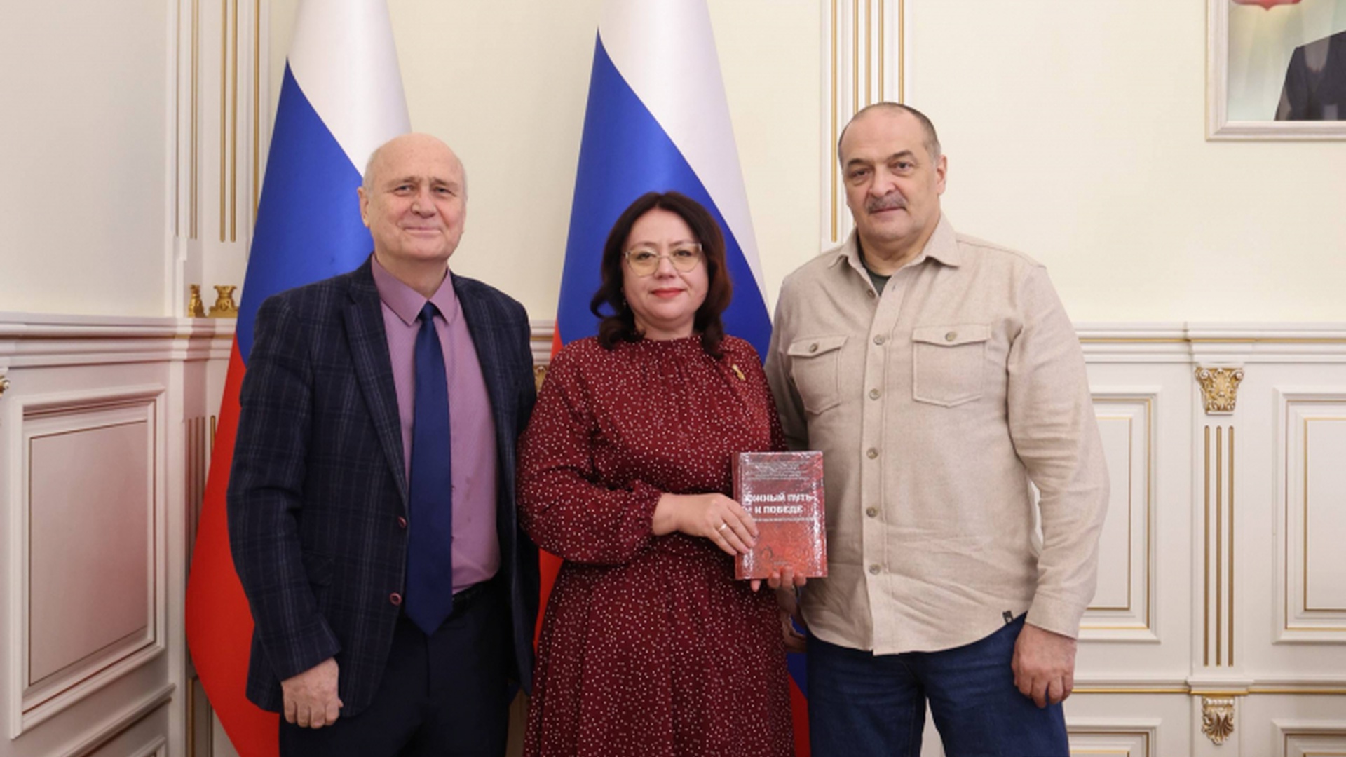Председатель Дагестанского отделения РГО Эльдар Магомедович Эльдаров и ведущий научный сотрудник ИИАЭ ДФИЦ РАН Ю. М. Лысенко вручили главе республики изданную работу.